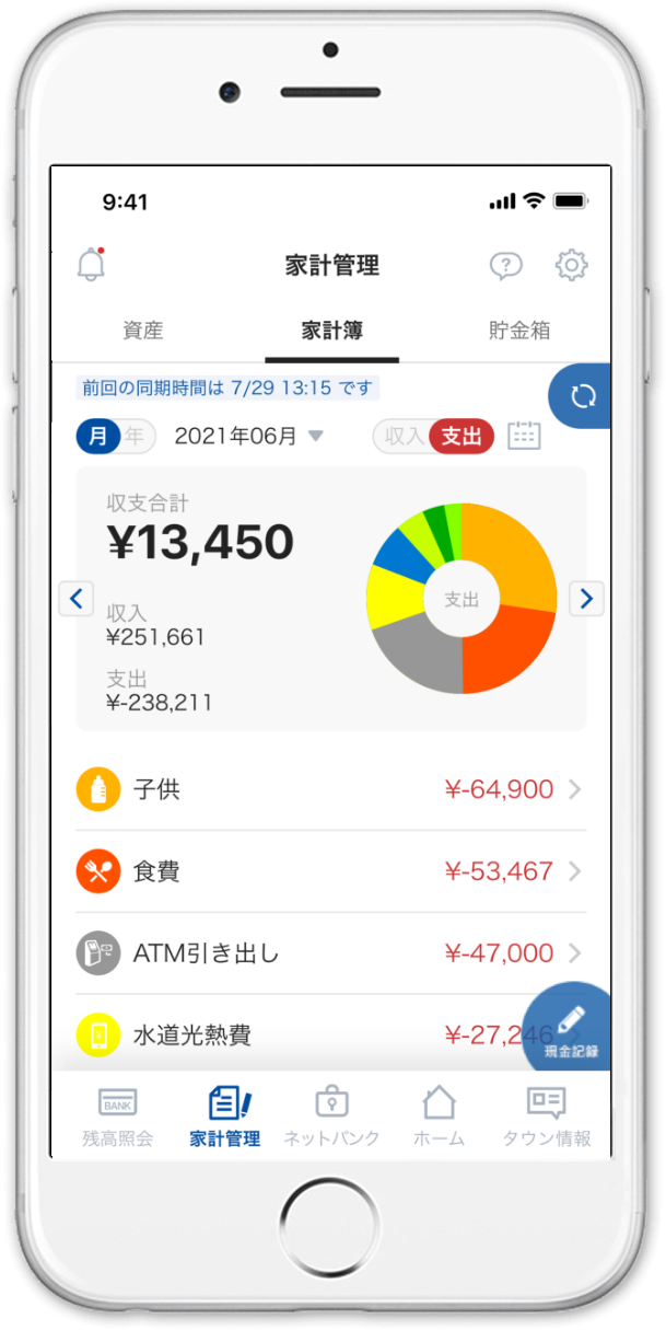 - 家計管理画面の「家計簿」タブにて、最新のデータを取得できない時、「更新」ボタンを押下すると最新のデータを取得できます。