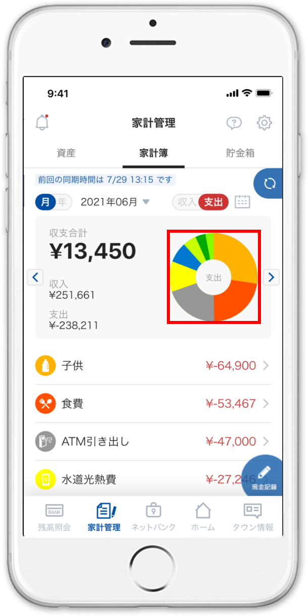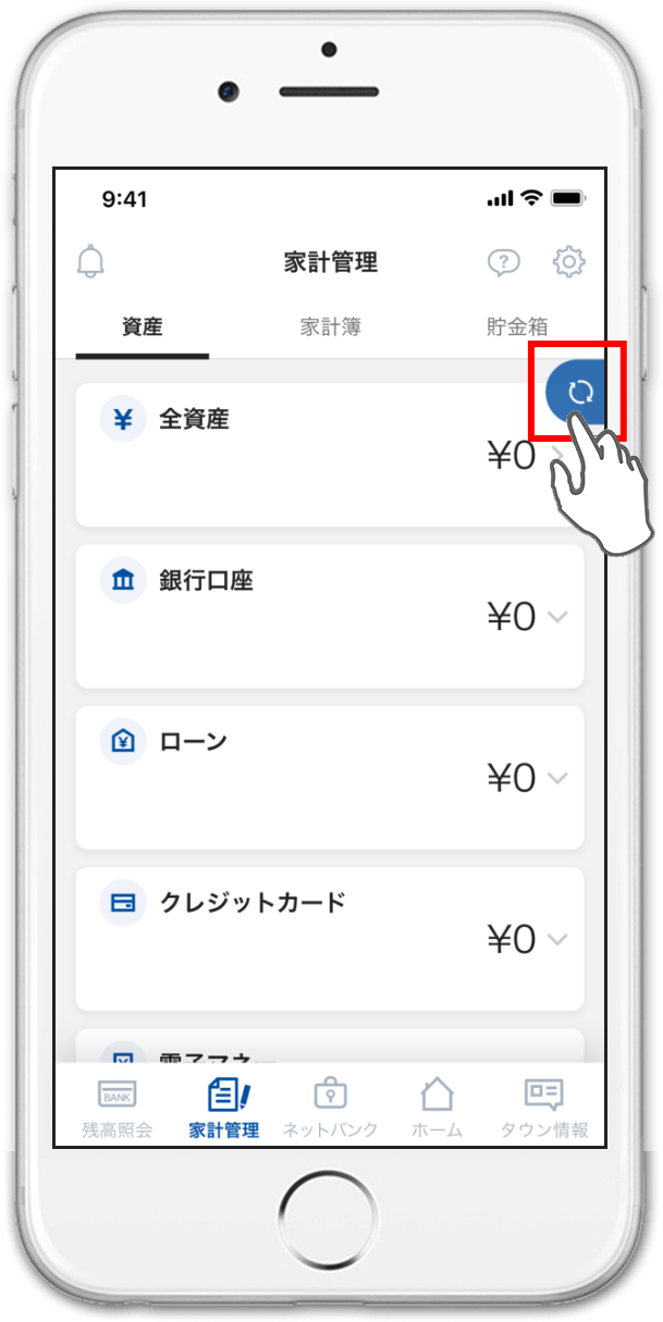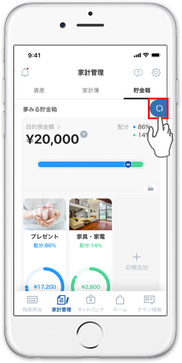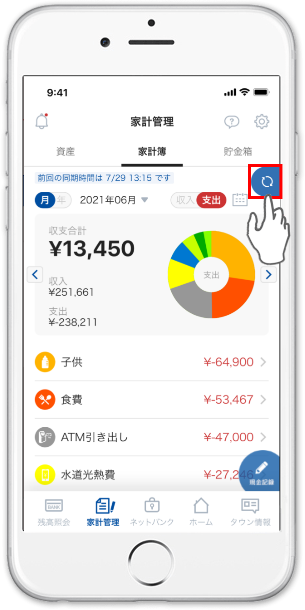 - 家計管理画面の「貯金箱」タブにて、最新のデータを取得できない時、「更新」ボタンを押下すると最新のデータを取得できます。