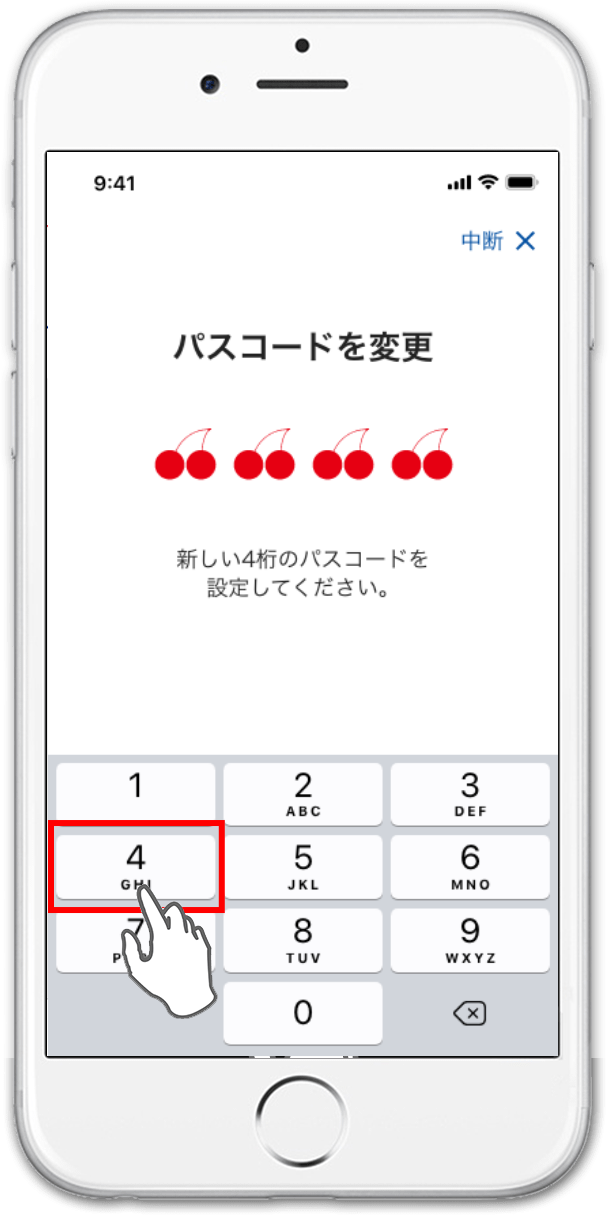 - 「パスコード変更」画面に新しい4桁の数字を入力します。