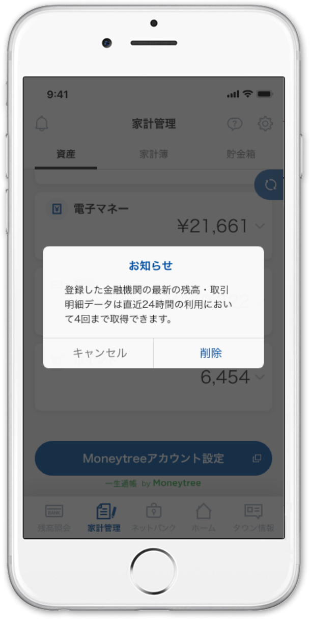 パスコードを連続5回入れ間違った場合、かんたん残高照会機能と資産管理機能の連携は解除されます。お手数ですが、それぞれ再度連携してください。なお、登録した銀行口座等の情報は上記連携後に再取得できます。