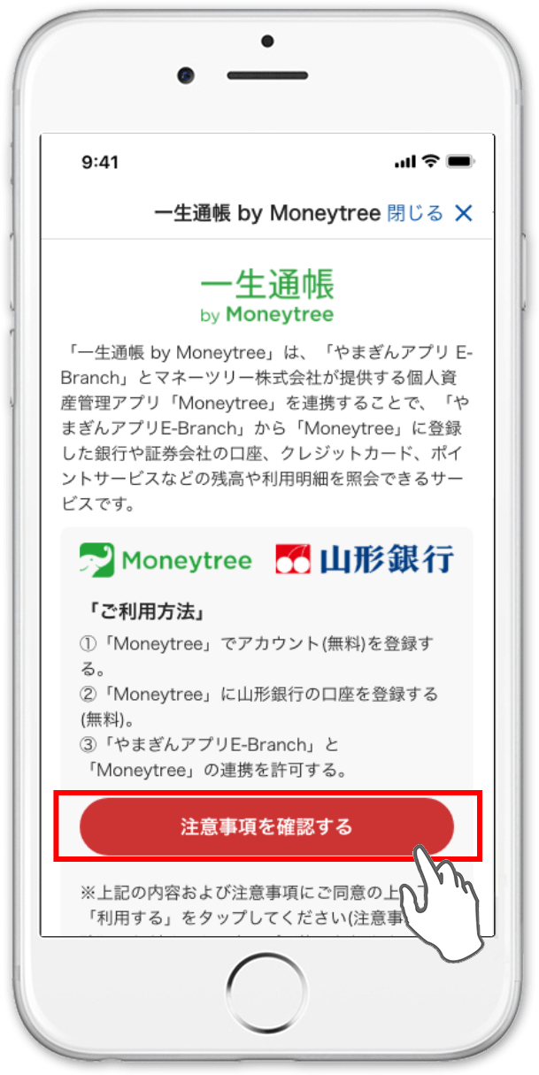- 内容をご確認いただき、「注意事項を確認する」をタップしご注意事項画面を表示します。