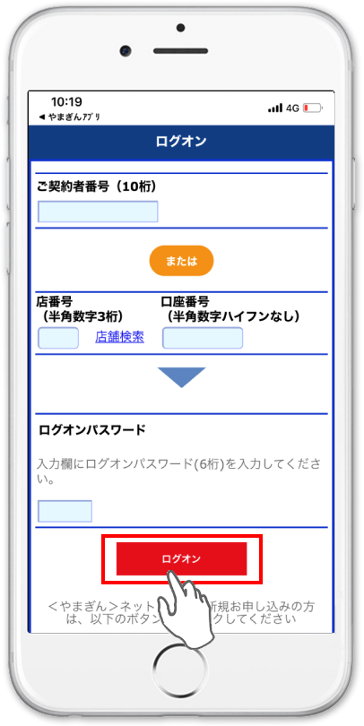 - アプリホーム画面より、ネットバンクをタップして、<やまぎん>ネットバンクの契約者情報(代表口座の店番・口座番号またはご契約者番号)、ログオンパスワードをご入力のうえログオンしてください。
