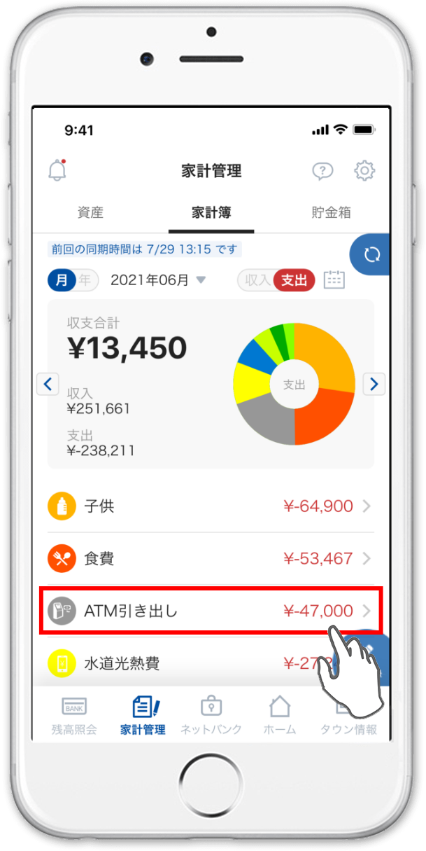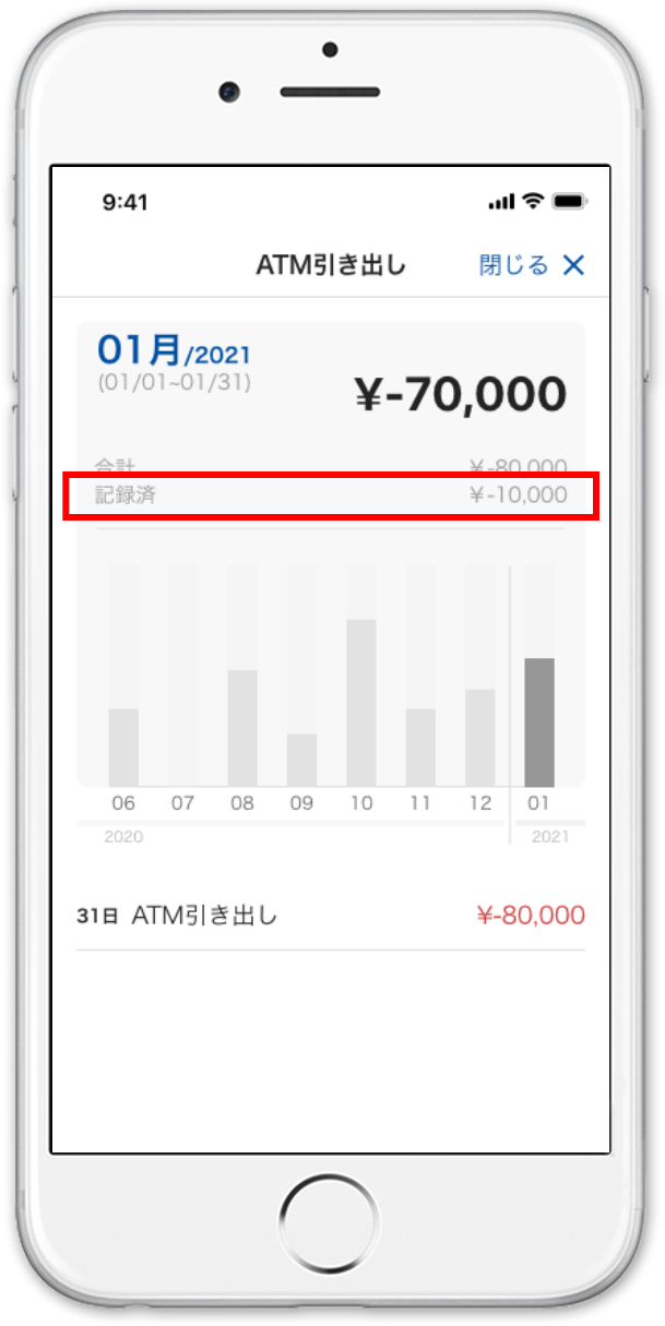 現金記録は『「ATM引き出し」した現金の使い道をカテゴリ区分する』機能で、以下の手順で利用することができます。