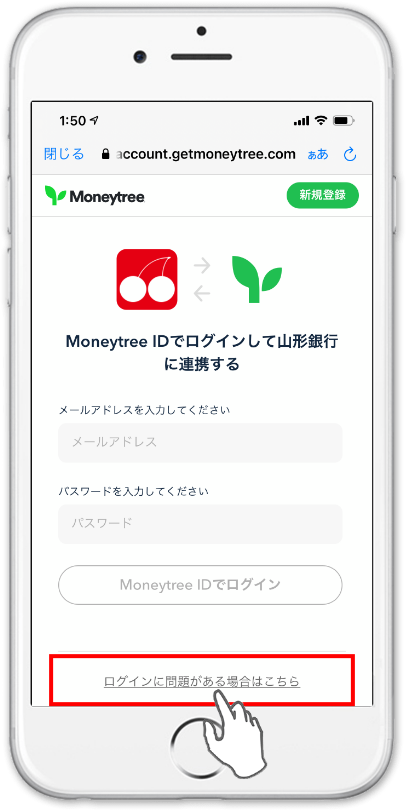 - Moneytreeログイン画面下部「ログインに問題がある場合はこちら」をタップします。