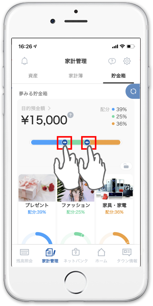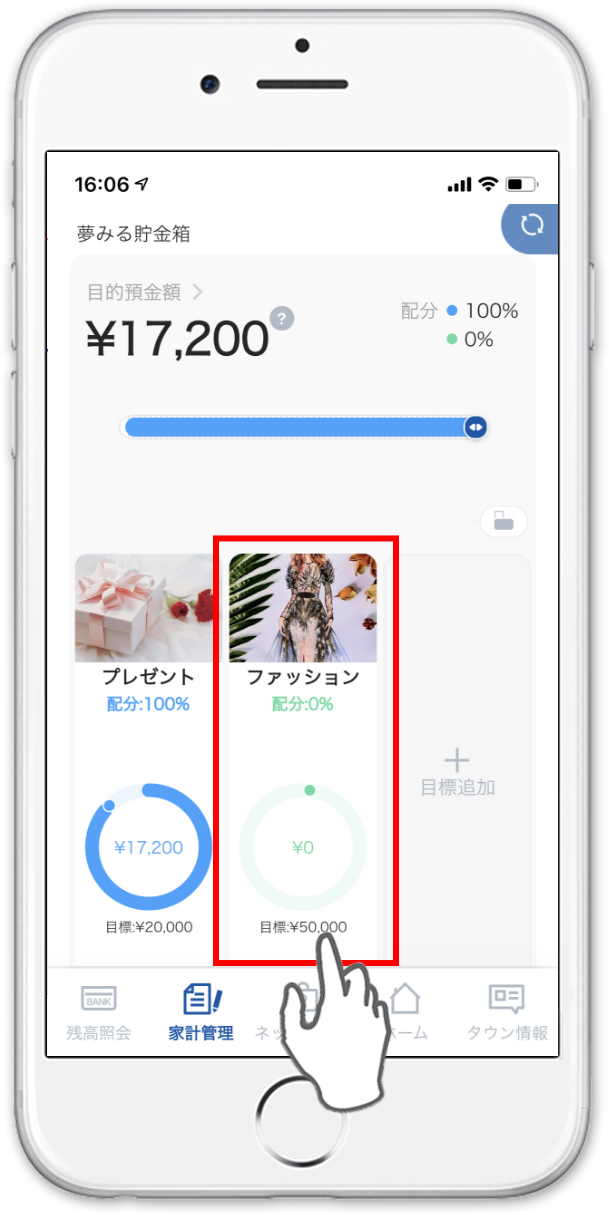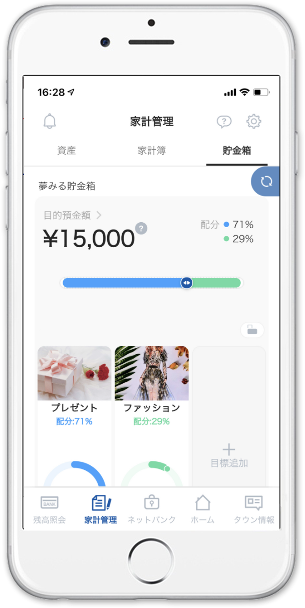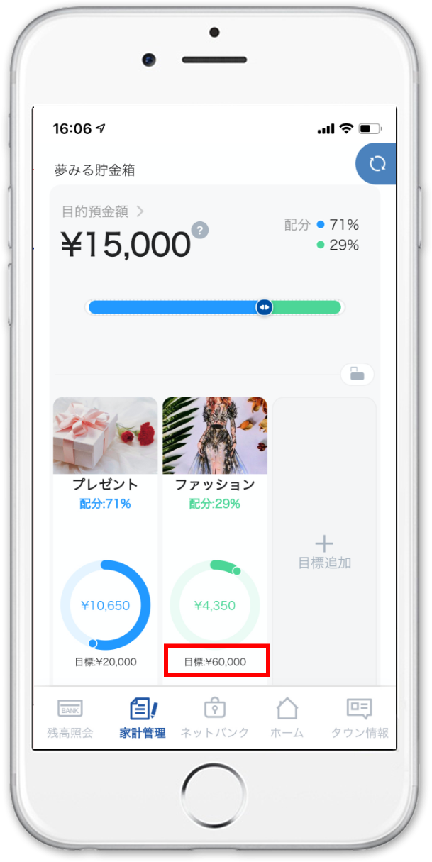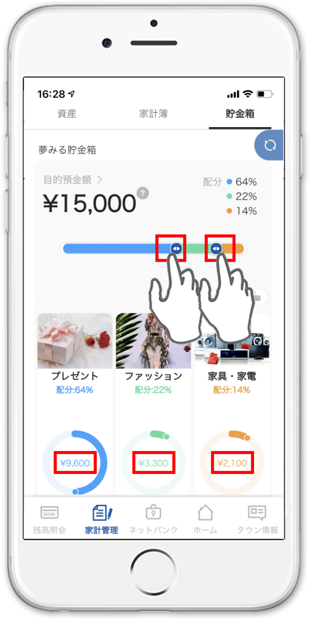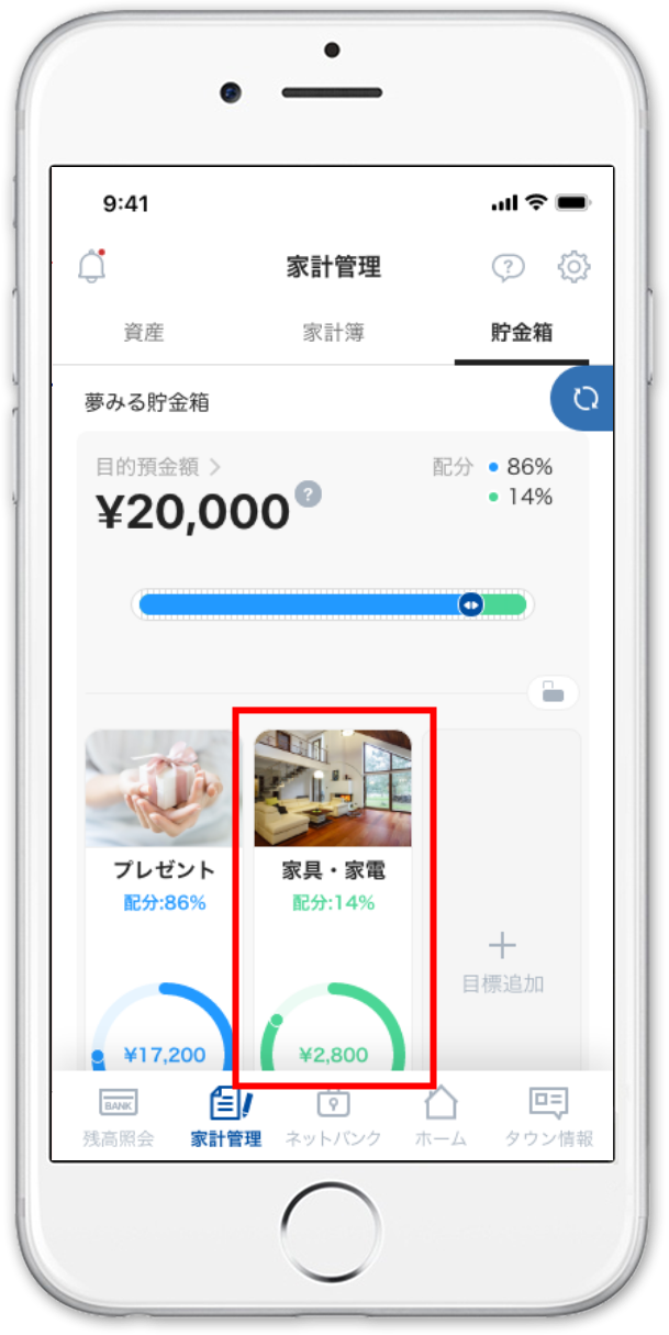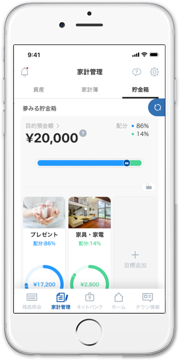 貯金目標を2つ以上登録している場合は、配分バーを左右に動かすことで各目標に対する貯金金額の配分比率を変更できます。