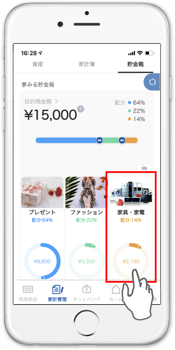 - 家計管理画面の「貯金箱」タブにて、スライドボタンを左右にスライドします。