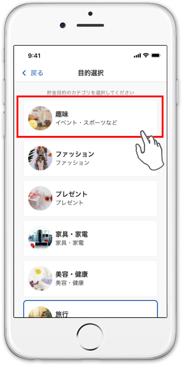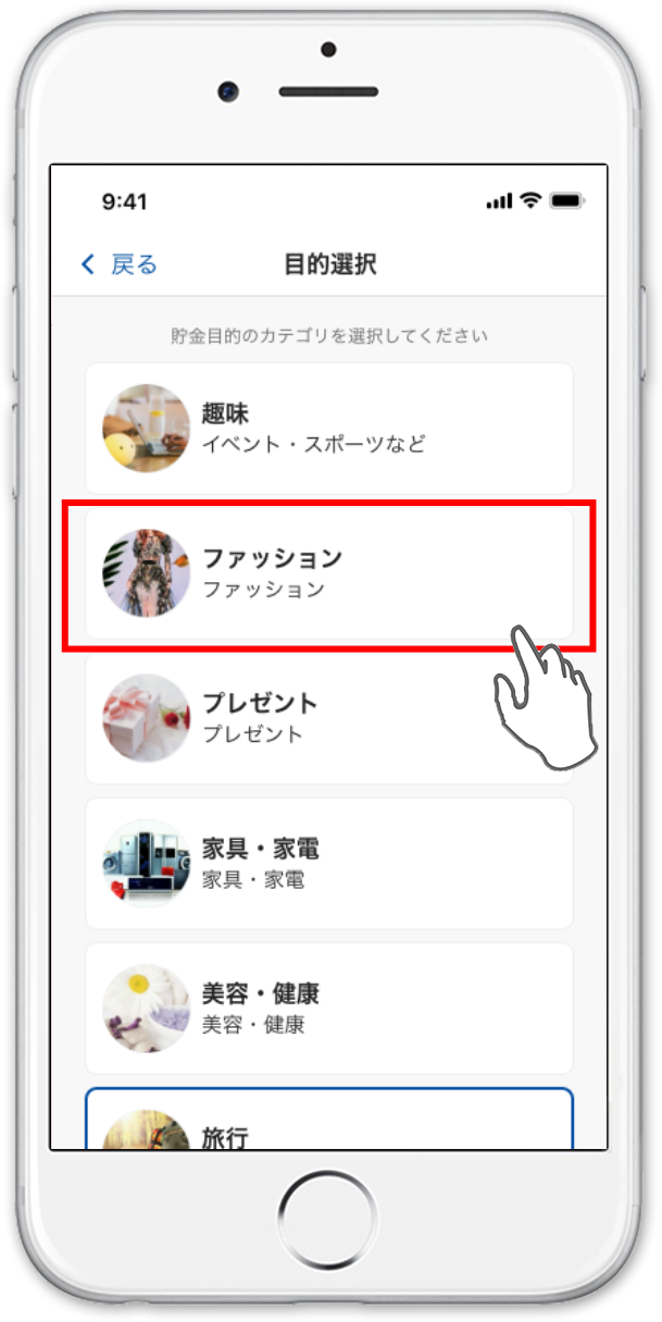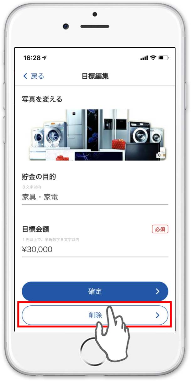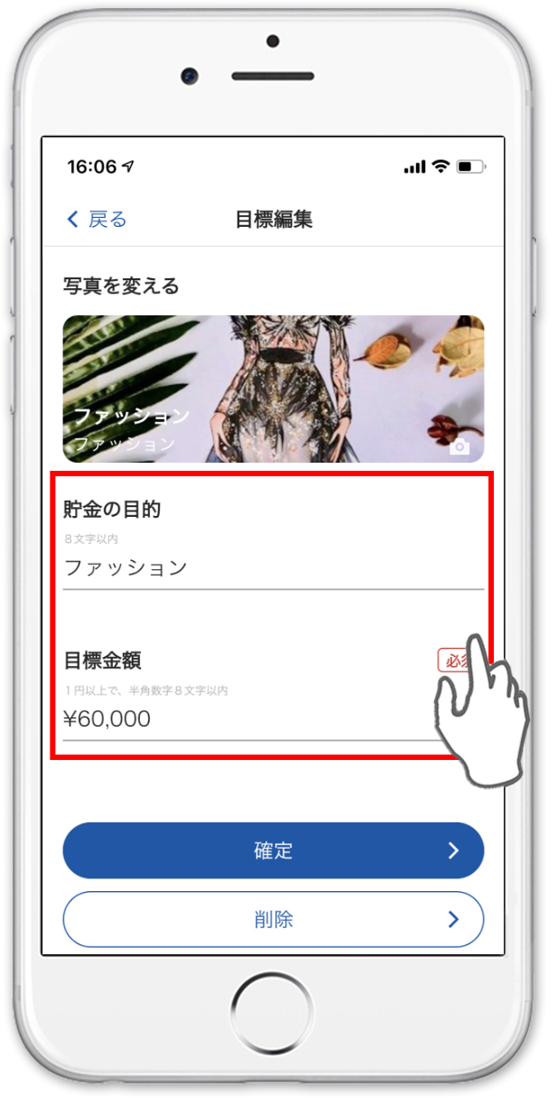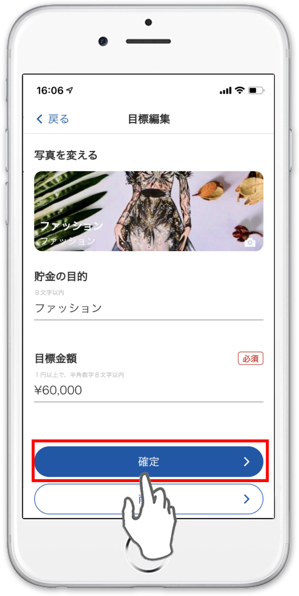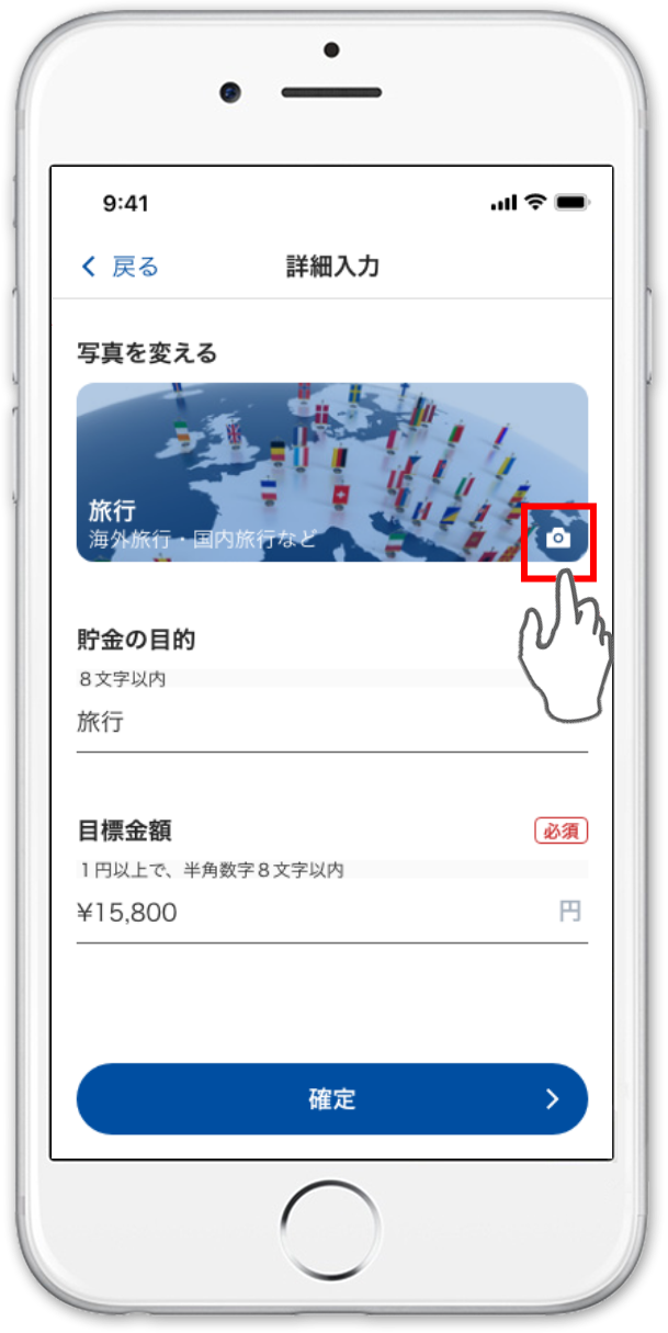- 貯金の目的と目標金額を入力します。またカメラアイコンをタップすると任意の画像を設定できます。