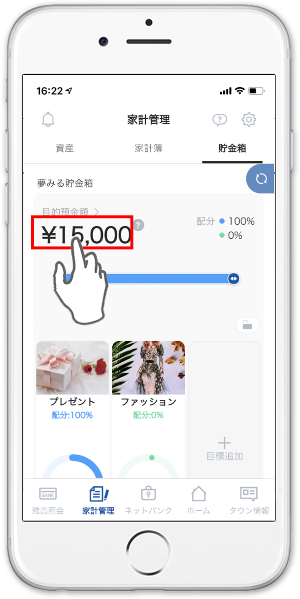 - 家計管理の「貯金箱」画面にて「目的預金額」をタップします。