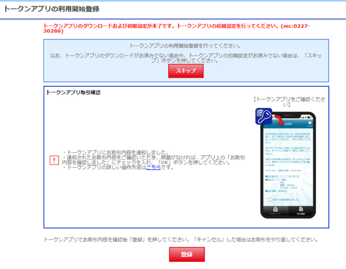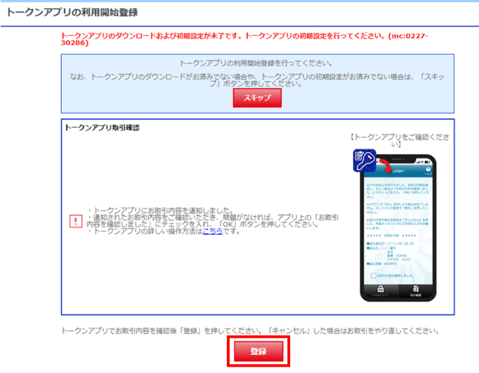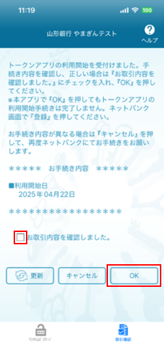 ネットバンクを開いたまま、スマートフォンからトークンアプリを起動し、「取引確認ボタン」をタップしてください。アプリに表示されている内容をご確認いただき、「お取引内容を確認しました」にチェックのうえ「OK」をタップしてください。③利用開始登録(ネットバンクでの操作です)